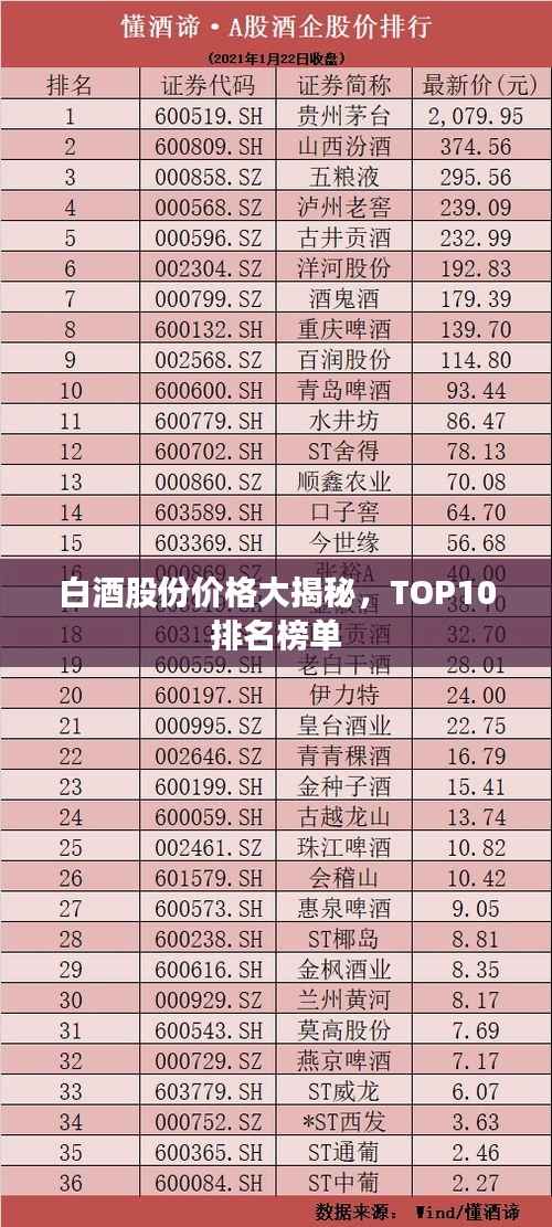 随着经济的发展和消费水平的提升,白酒行业在中国市场上持续繁荣,各大白酒企业的股份价格成为投资者关注的热点,以下是当前白酒股份价格排名前十名的企业。