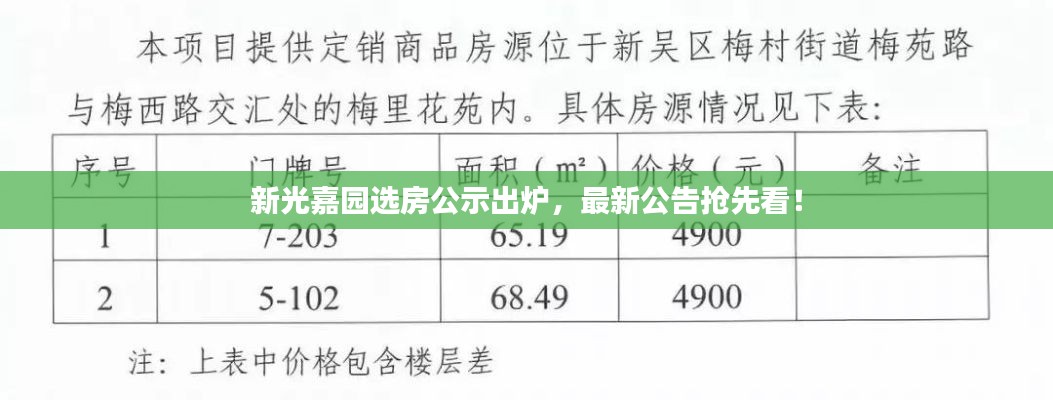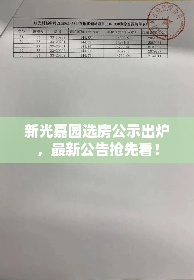 本文旨在为读者提供关于新光嘉园选房公示公告最新的信息和全面的解读,希望能够帮助广大购房者更好地了解选房动态,为自己的购房决策提供参考。