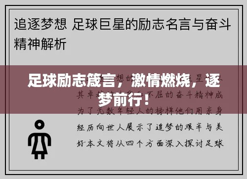 在足球这片充满激情与热血的赛场上,每一刻都充满了挑战与机遇,对于热爱足球的人来说,足球不仅仅是一项运动,更是一种精神寄托,一种生活态度,以下是一些有关足球的励志语录,让我们一起感受足球的魅力,激发内心的力量。