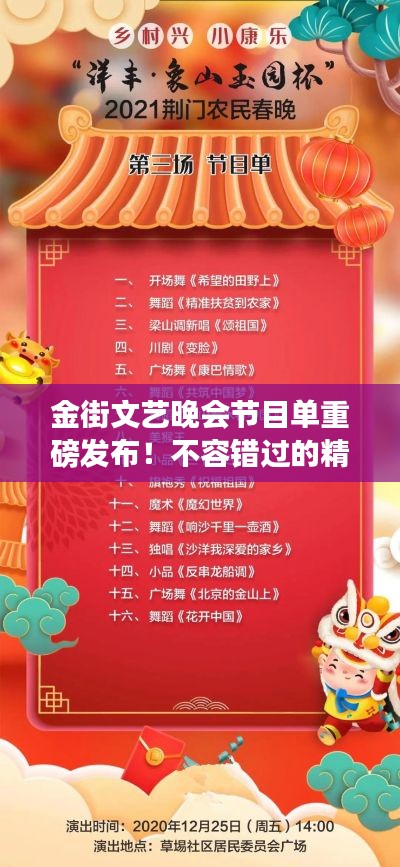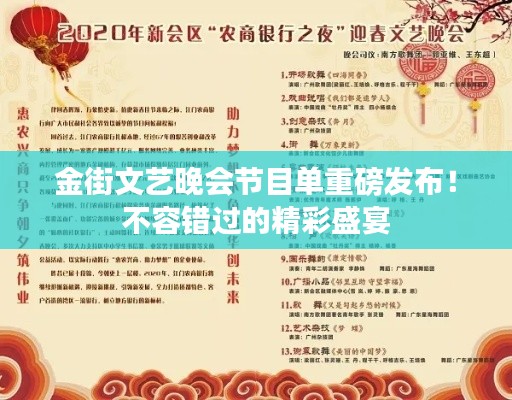 金街文艺晚会节目单表的最新公布,让人们期待不已,这场文化盛宴将在夏日的夜晚为人们带来无尽的欢乐和感动,让我们一起期待这场精彩纷呈的文艺盛会吧!