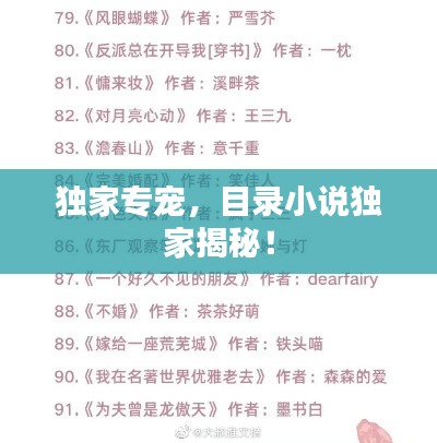 《独家专宠目录小说》的目录结构独特而有趣,作者根据故事情节和章节安排,设计了一个独特的目录结构,这个目录不仅展示了故事的主要情节和人物关系,还通过巧妙的布局,吸引了读者的注意力。