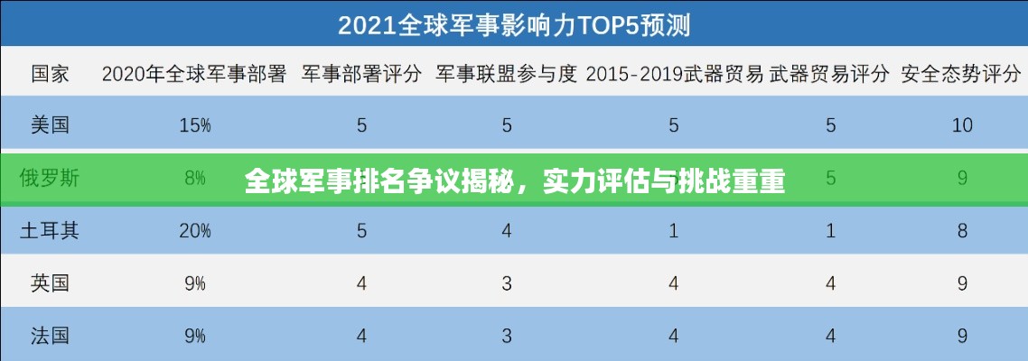 在全球军事格局不断变化的背景下,各国军事实力的排名成为了国际关注的焦点,关于某国被冠以世界军事排名第二的称谓引发了广泛的争议,这一排名的背后,涉及到多种因素,包括经济实力、军事实力、科技水平以及国际影响力等,本文将探讨这一排名的争议点,分析实力评估的复杂性,以及面临的挑战。