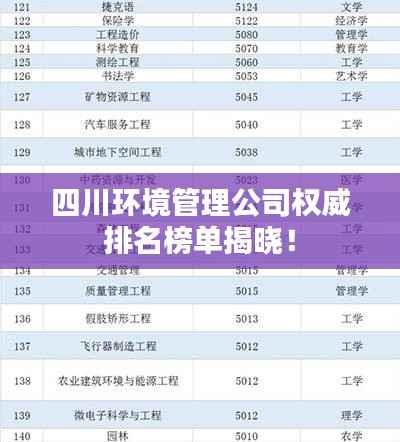随着环保意识的日益增强,环境管理公司的业务逐渐受到社会各界的广泛关注,四川省作为我国西部地区的重要省份,其环境管理公司的实力和服务质量也备受瞩目,本文将介绍四川环境管理公司的排名及相关信息,以便为需要服务的客户提供参考。