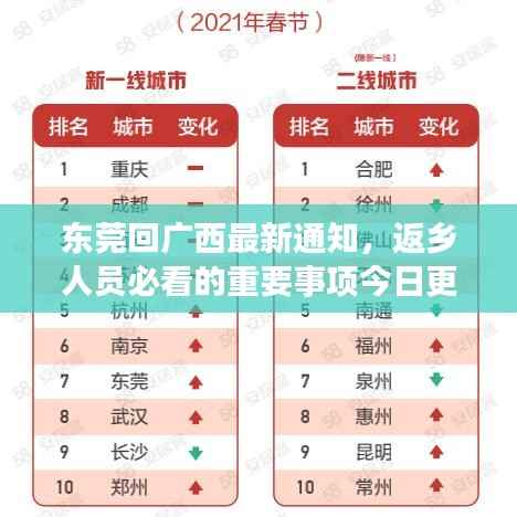 随着春节的临近,越来越多的人开始关注返乡事宜,特别是对于在东莞工作并计划返回广西的朋友们来说,最新的通知公告是他们关注的焦点,本文将为大家介绍东莞回广西的最新通知,帮助大家了解返乡时需要注意的事项。
