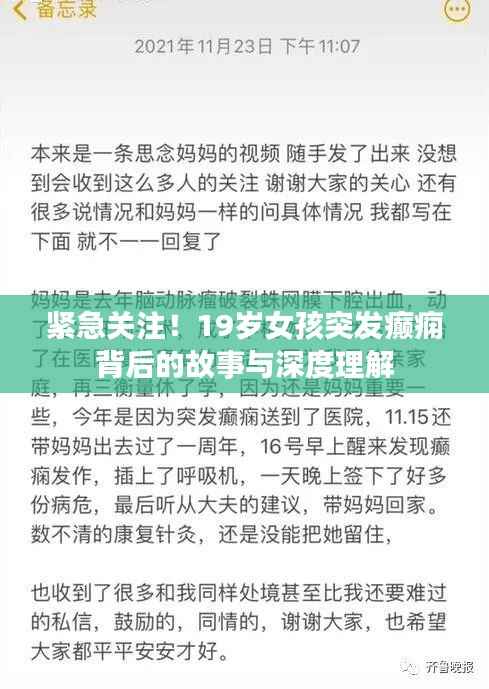 据报道,这位年仅19岁的女孩在某次突发情况下出现了癫痫症状,癫痫是一种由脑部神经元异常放电引起的慢性疾病,患者可能出现短暂的失去意识、抽搐等症状,此次突发情况无疑给这个女孩及其家人带来了极大的恐慌与困扰。