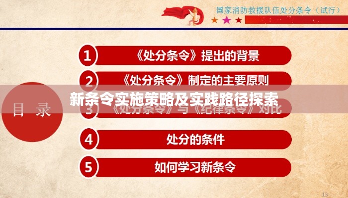 随着社会的不断发展和进步,各行各业都在不断地更新和完善自身的规章制度,以适应新的环境和挑战,新条令的出台,是为了更好地规范行业秩序,提高工作效率,保障公众利益,新条令的落实却是关系到其能否发挥实效的关键环节,本文将从实际操作角度出发,探讨新条令的落实策略与实践路径。