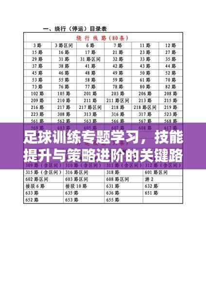 足球训练专题学习是提升足球技能与策略的关键路径,通过专题学习,球员可以系统地学习和掌握足球技能、战术和策略,增强体能,培养团队精神,足球训练需要长期坚持和付出努力,只有不断地练习和积累,才能在足球领域取得进步,我们鼓励所有热爱足球的人士积极参与足球训练专题学习,不断提升自己的技能水平。