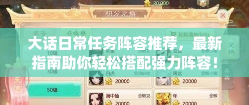 随着游戏版本的更新,大话日常任务阵容也需要进行相应的调整,本文将为大家推荐最新的大话日常任务阵容,帮助玩家更高效地完成任务,获取丰厚奖励。