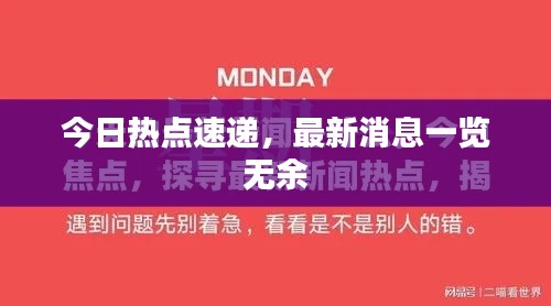 今日的最新消息涵盖了政治、科技、社会、经济、文化等多个领域,无论是国际形势的新动态,还是科技领域的创新进展,亦或是社会热点事件的最新进展,都在向我们展示一个日新月异的世界,我们也需要时刻关注这些最新消息,以便更好地了解世界的变化,把握时代的脉搏。