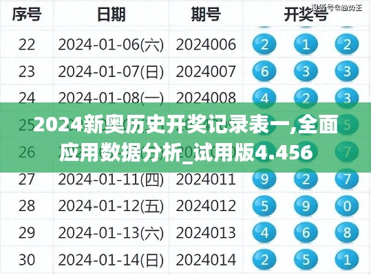 "2024新奥历史开奖记录表一"涵盖了澳门彩票的开奖历史数据,对于分析彩票频率、概率和趋势至关重要。全面应用数据分析_试用版4.456通过深入挖掘这些数据,帮助用户更好地理解彩票开奖的内在规律,从而在澳门政策文件的背景下做出更明智的投资决策。