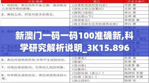 澳门作为中国特别行政区,一直以其独特的经济模式和文化多样性而著称,多年来经济发展迅猛。最近澳门出台一项新政策文件——“新澳门一码一码100准确新,科学研究解析说明_3K15.896”,旨在以科学研究为依据,探讨政策有效性、准确性和可达性。以下是对该政策文件的详细解读和说明,旨在通过科学研究的视角对其进行全面的解析和探讨。